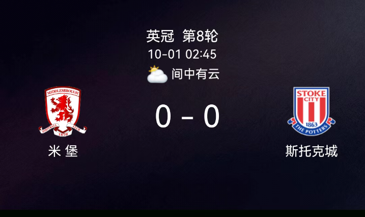 北京时间10月1日英格兰足球冠军联赛第8轮,米德尔斯堡主场对阵斯托克城。两队攻防胶着均未破局,全场多轮染黄仍难分胜负,最终比分,米德尔斯堡0-0斯托克城。