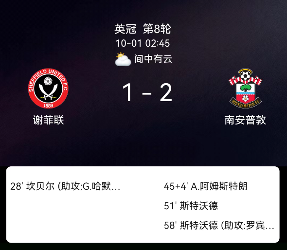 北京时间10月1日英格兰足球冠军联赛第8轮,谢菲尔德联主场对阵南安普顿。主队先破门后遭逆转,客队核心球员梅开二度制胜,最终比分,谢菲尔德联1-2南安普顿。