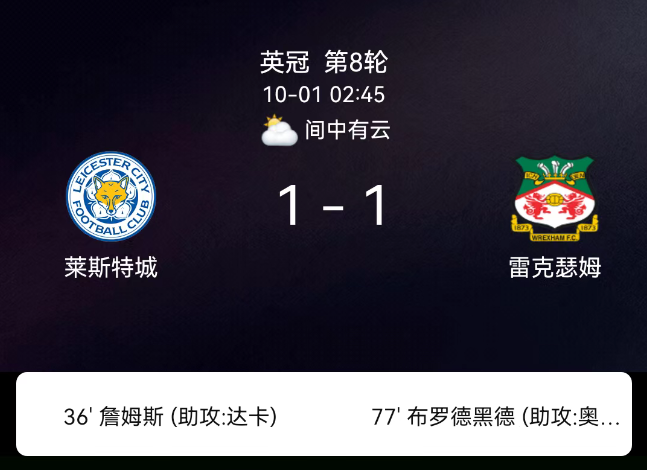 北京时间10月1日,英格兰足球冠军联赛第8轮,莱斯特城主场迎战雷克瑟姆。主队先领先遭追平,双方多轮染黄终握手言和,最终比分,莱斯特城1-1雷克瑟姆。
