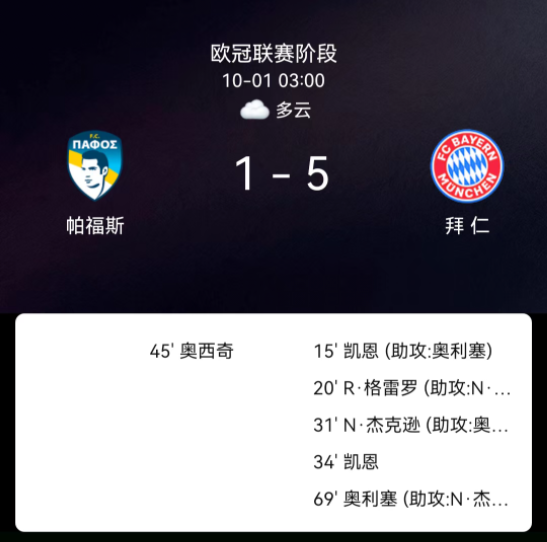 北京时间10月1日,欧洲冠军联赛联赛阶段第2轮,帕福斯主场迎战拜仁慕尼黑。拜仁多点开花狂轰5球,主队仅靠世界波扳回一城,最终比分,帕福斯1-5拜仁慕尼黑。