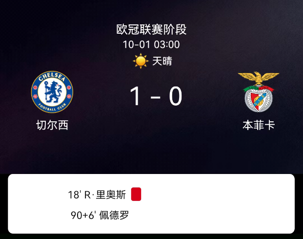 北京时间10月1日,欧洲冠军联赛联赛阶段第2轮,切尔西主场迎战本菲卡。主队凭乌龙球领先,终场前被罚下一人仍守住胜果,最终比分,切尔西1-0本菲卡。