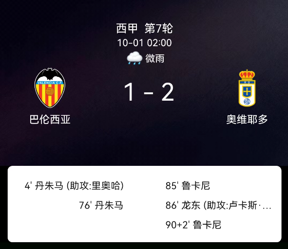 北京时间10月1日,西班牙足球甲级联赛第7轮,瓦伦西亚主场对阵皇家奥维耶多。主队先破门却错失点球,客队终场前连入两球逆转,最终比分,瓦伦西亚1-2皇家奥维耶多。