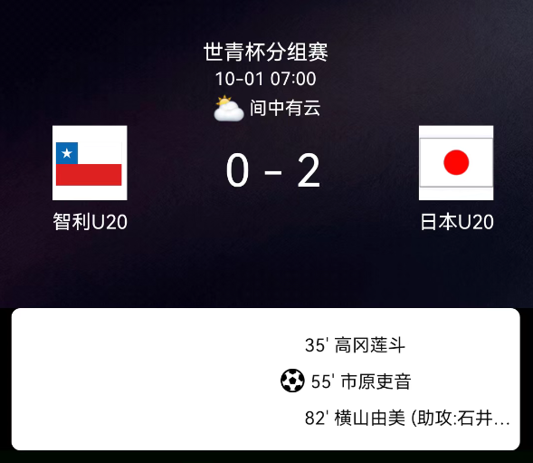 北京时间10月1日,U20世界杯小组赛第2轮,智利U20主场对阵日本U20。客队错失点球后连入两球锁定胜局,双方均有球员染黄,最终比分,智利U200-2日本U20。