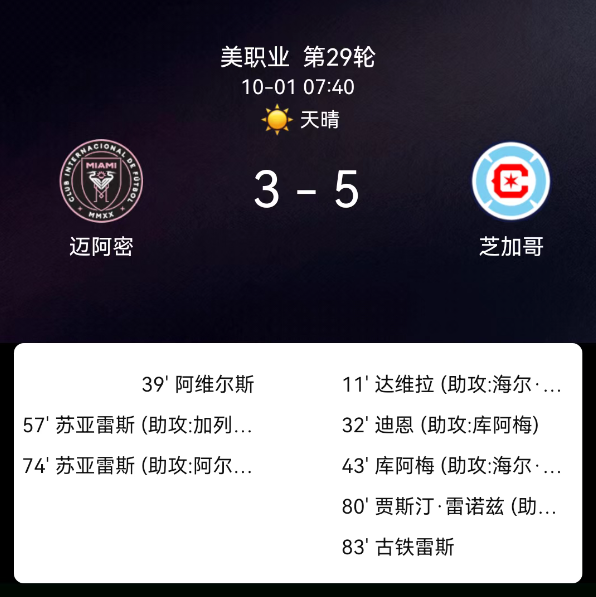 北京时间10月1日,美国职业足球大联盟常规赛,迈阿密国际主场迎战芝加哥火焰。双方上演进球大战,客队凭多点开花取胜,最终比分,迈阿密国际3-5芝加哥火焰。