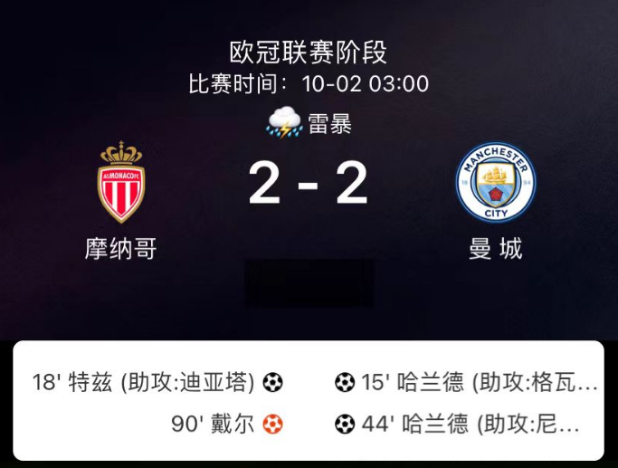 第90分钟,冈萨雷斯送点,戴尔点射绝平,摩纳哥2-2曼城