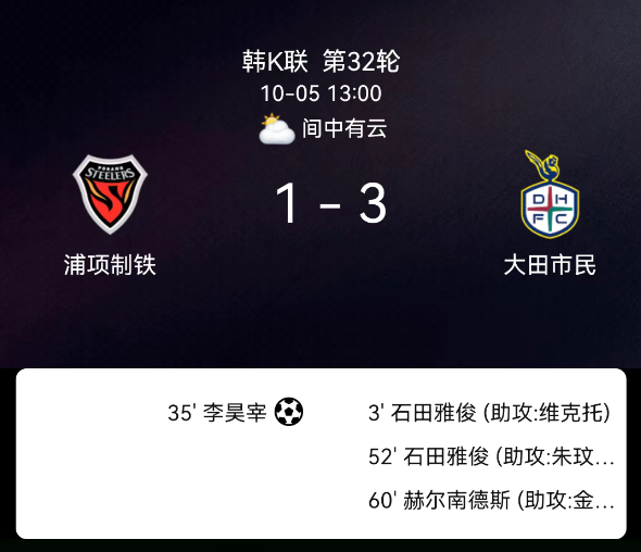 北京时间10月5日,韩国经典K联赛第32轮,浦项铁人主场迎战大田韩亚市民。客队先破局后遭追平,下半场连入两球锁定胜局,最终比分,浦项铁人1-3大田韩亚市民。