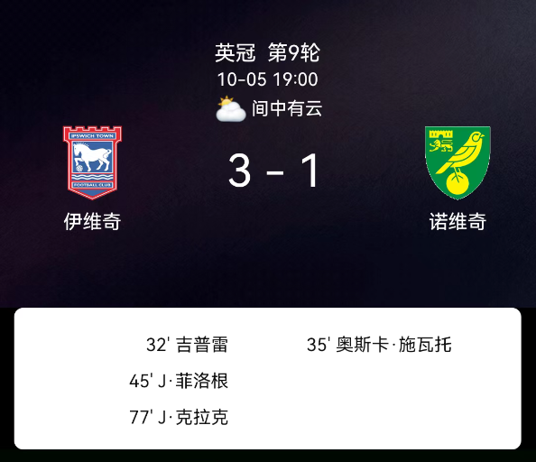 北京时间10月5日,英格兰足球冠军联赛第9轮,伊普斯维奇主场迎战诺维奇。上半场第32分钟基普雷为伊普斯维奇首开纪录,第35分钟施瓦陶助诺维奇扳平,第45分钟菲洛吉恩破门助主队再度领先;下半场第77分钟杰克-克拉克进球扩大优势,最终比分,伊普斯维奇3-1诺维奇。