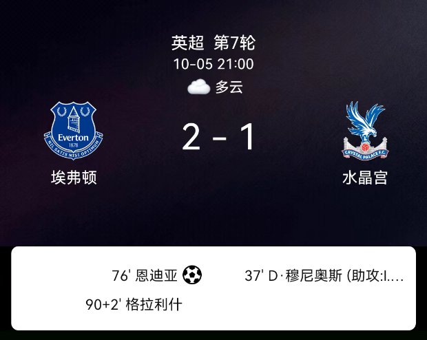 北京时间10月5日,英格兰足球超级联赛第7轮,埃弗顿主场迎战水晶宫。第38分钟伊斯梅拉-萨尔助攻穆尼奥斯破门助水晶宫先领先,第76分钟恩迪亚耶点球为埃弗顿扳平,第90+2分钟格拉利什挡射绝杀,最终比分,埃弗顿2-1水晶宫。