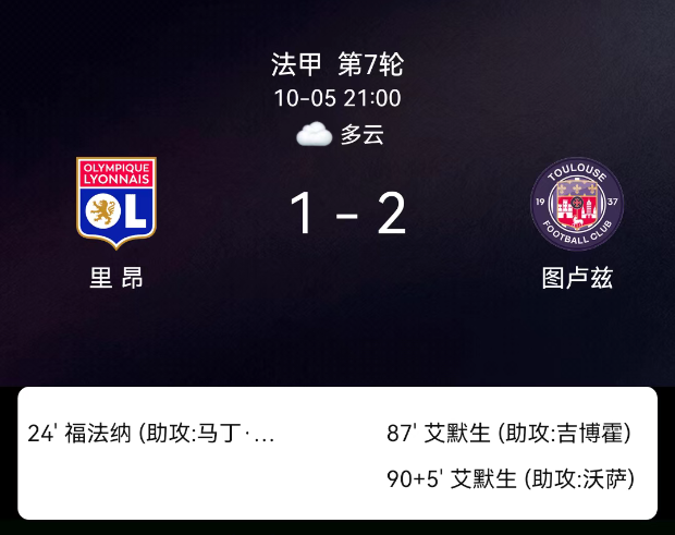 北京时间10月5日,法国足球甲级联赛第7轮,里昂主场迎战图卢兹。第24分钟萨特里亚诺助攻马利克-福法纳破门助里昂领先,第87分钟埃默松抓住里昂失误扳平,第90+5分钟埃默松头槌完成绝杀,最终比分,里昂1-2图卢兹。
