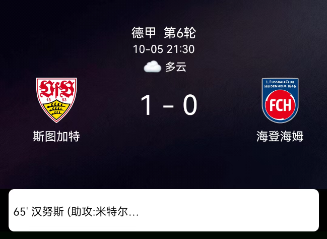 第65分钟(进球):斯图加特锁定胜局!米特尔施泰特送出助攻,哈努斯射门得手,主队1-0领先。