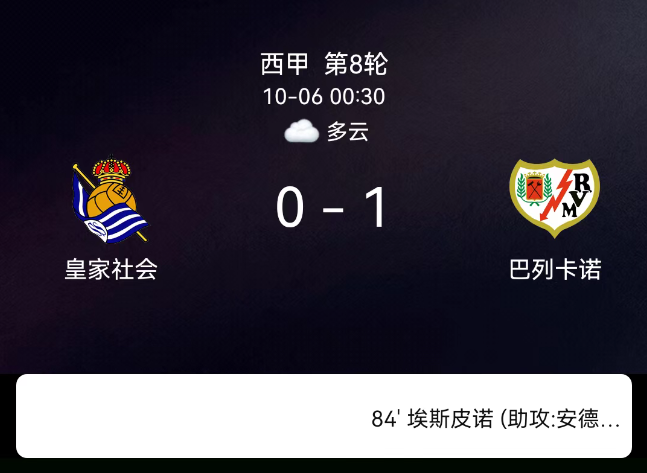 北京时间10月6日,西班牙足球甲级联赛第8轮,皇家社会主场迎战巴列卡诺。第61分钟皇家社会先吃黄牌,第62分钟巴列卡诺帕拉松因犯规领黄;下半场第77分钟巴列卡诺换上前锋埃斯皮诺加强进攻,第84分钟拉蒂乌送出助攻,埃斯皮诺冷静施射完成绝杀,补时阶段巴列卡诺勒戎再染黄,最终比分,皇家社会0-1巴列卡诺。