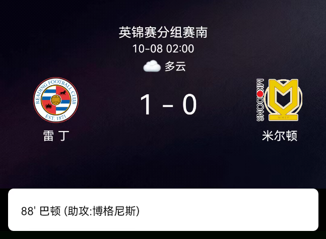 北京时间10月8日,英格兰联赛锦标赛小组赛南区,雷丁主场迎战米尔顿凯恩斯。第31分钟雷丁球员先因犯规领得本场首张黄牌,1分钟后雷丁兰尼再因犯规染黄;第38分钟米尔顿凯恩斯基恩-刘易斯-伯格斯犯规吃牌,半场战罢双方0-0平。下半场第71分钟米尔顿凯恩斯西蒙尼-特罗索、第74分钟汤普森先后领黄,第88分钟博格尼斯助攻肖恩-巴顿头球破门,最终比分,雷丁1-0米尔顿凯恩斯。