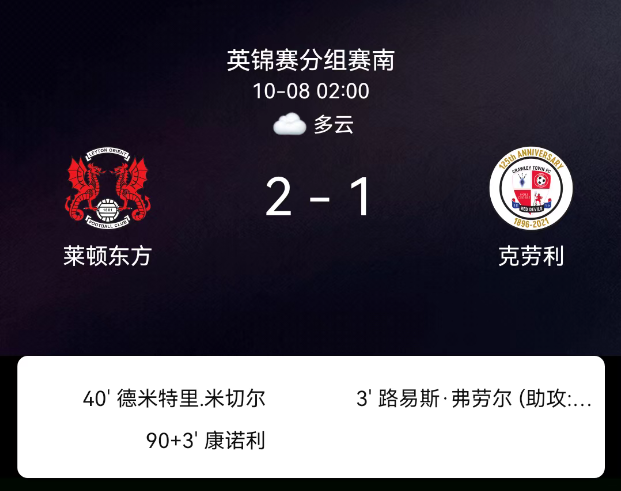 北京时间10月8日,英格兰联赛锦标赛小组赛南区,莱顿东方主场迎战克劳利。开场仅3分钟,克劳利齐曼加助攻路易斯-弗劳尔破门,客队1-0领先;第19分钟莱顿东方球员因犯规领首黄,第40分钟德米特里-米切尔破门助主队扳平;下半场第65分钟克劳利防守球员犯规染黄,补时第3分钟阿隆-康诺利打入制胜球,最终比分,莱顿东方2-1克劳利。