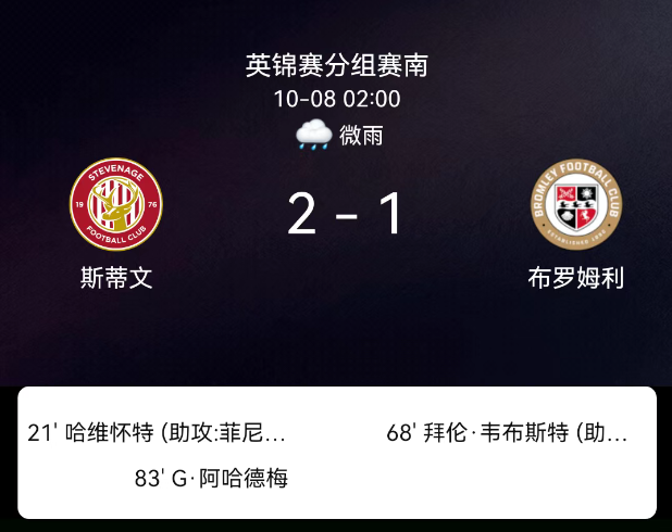 北京时间10月8日,英格兰联赛锦标赛小组赛南区,斯蒂夫尼奇主场迎战布罗姆利。第16分钟布罗姆利球员因拼抢犯规先吃黄牌,第21分钟菲尼克斯-帕特森助攻哈维-怀特破门,斯蒂夫尼奇1-0领先;第68分钟奥马尔-索翁米助攻韦伯斯特破门,布罗姆利扳平比分;第75分钟斯蒂夫尼奇球员战术犯规染黄,第83分钟叶海亚打入制胜球,最终比分,斯蒂夫尼奇2-1布罗姆利。