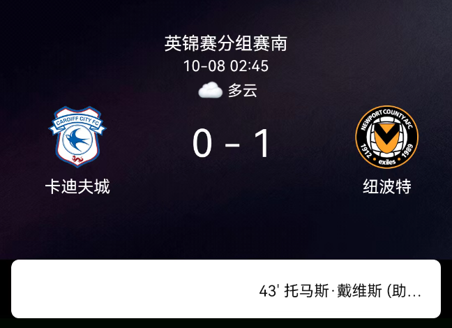 北京时间10月8日,英格兰联赛锦标赛小组赛南区,卡迪夫城主场迎战纽波特。第25分钟卡迪夫城球员因中场拼抢犯规先吃黄牌,第38分钟纽波特后卫拦截动作过大领黄;上半场临近尾声,第43分钟卡伊-惠特莫尔送出助攻,汤姆-戴维斯接球破门打入全场唯一进球;下半场双方均无有效破门机会,补时阶段卡迪夫城替补球员因拖延比赛时间再染黄,最终比分,卡迪夫城0-1纽波特。