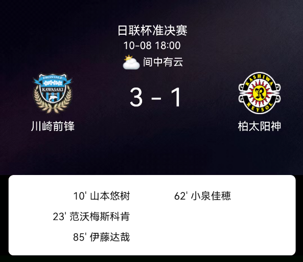 北京时间10月8日,日本联赛杯半决赛首回合,川崎前锋主场迎战柏太阳神。第10分钟马尔西尼奥助攻山本悠树破门,川崎1-0领先;第23分钟范韦梅斯凯尔肯再入一球扩大优势;第32分钟川崎费利佩-乌雷莫维奇犯规领黄,第37分钟柏太阳神原川力亦因犯规吃牌,半场战罢川崎2-0领先。下半场第62分钟小屋松知哉助攻小泉佳穗破门,柏太阳神扳回一城;第85分钟宫城天助攻伊藤达哉破门,同时柏太阳神垣田裕晖染黄,最终比分,川崎前锋3-1柏太阳神。