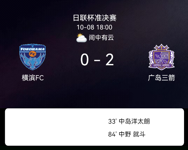 北京时间10月8日,日本联赛杯半决赛首回合,横滨FC主场迎战广岛三箭。第21分钟横滨FC球员因拼抢犯规先吃黄牌,第33分钟盐谷司送出精准助攻,中岛洋太朗冷静施射破门,广岛三箭1-0领先;下半场第65分钟广岛三箭球员战术犯规领黄,第83分钟佐佐木翔再送助攻,中野就斗接球破门扩大比分,补时阶段横滨FC替补球员因拖延时间再染黄,最终比分,横滨FC0-2广岛三箭。