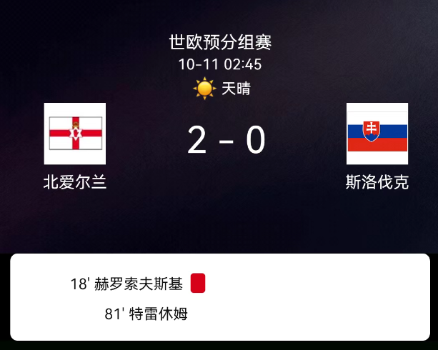 北京时间10月11日,2026年世界杯欧洲区预选赛第一阶段小组赛第7轮,北爱尔兰主场迎战斯洛伐克。上半场第18分钟,比赛迎来首个进球,斯洛伐克球员帕特里克?赫罗绍夫斯基在解围时不慎自摆乌龙,帮助北爱尔兰1-0意外取得领先。第60分钟,北爱尔兰球员因犯规吃到本场首张黄牌。下半场斯洛伐克虽以62%的控球率占据主动,但始终未能攻破对手球门。第76分钟,北爱尔兰的康纳?布拉德利再吃一黄。第81分钟,北爱尔兰锁定胜局,特赖?休姆接进攻配合后射门得手,将比分扩大至2-0,最终比分,北爱尔兰2-0斯洛伐克。