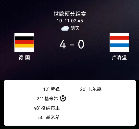 北京时间10月11日,2026年世界杯欧洲区预选赛第一阶段小组赛第7轮,德国坐镇主场迎战卢森堡。开场第4分钟,格纳布里射门经折射入网,但因队友手球犯规被判无效。第14分钟,德国打破僵局,劳姆主罚前场任意球划出完美弧线直挂死角,斩获国家队首粒正式比赛进球,德国1-0领先。第23分钟,格纳布里禁区内造点,基米希主罚点球命中;1分钟后,卢森堡球员卡尔森因手球犯规被VAR裁定直红罚下,德国以多打一人并2-0领先。下半场第49分钟,阿德耶米送出直塞,卢森堡后卫铲球失误,格纳布里前插推射远角破门,将比分扩大至3-0。第51分钟,德国角球进攻引发禁区乱战,基米希门前补射破门完成梅开二度。此后维尔茨任意球击中立柱错失良机,最终比分,德国4-0卢森堡,凭借净胜球优势升至小组榜首。