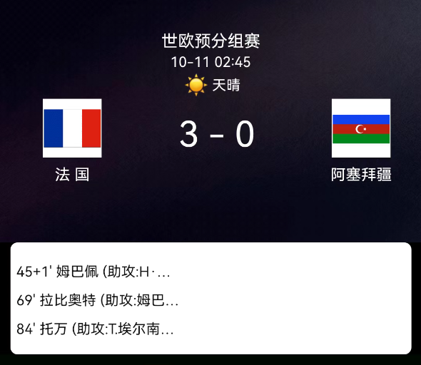 北京时间10月11日02:45,2026年世界杯欧洲区预选赛第一阶段小组赛第7轮,法国队坐镇巴黎王子公园球场迎战阿塞拜疆。上半场第10分钟,古斯托禁区右路抽射被门将扑出;第26分钟,阿塞拜疆球员因犯规吃到本场首张黄牌。补时第2分钟,姆巴佩上演个人秀,连过数名防守球员后禁区低射远角破门,帮助法国1-0打破僵局。下半场第50分钟,埃基蒂克右路突破抽射击中立柱错失良机;第53分钟,阿塞拜疆的阿赫梅德扎德再吃一黄。第64分钟,法国球员拉比奥因犯规领到黄牌。第69分钟,姆巴佩左路精准传中,拉比奥禁区头球破门,将比分扩大至2-0。第82分钟,姆巴佩在拼抢中右脚踝旧伤复发,一瘸一拐离场并被托万替换下场,他将因此缺席下一轮对阵冰岛的比赛。仅两分钟后,替补登场的托万禁区凌空侧钩破门锁定胜局,最终比分,法国3-0阿塞拜疆。