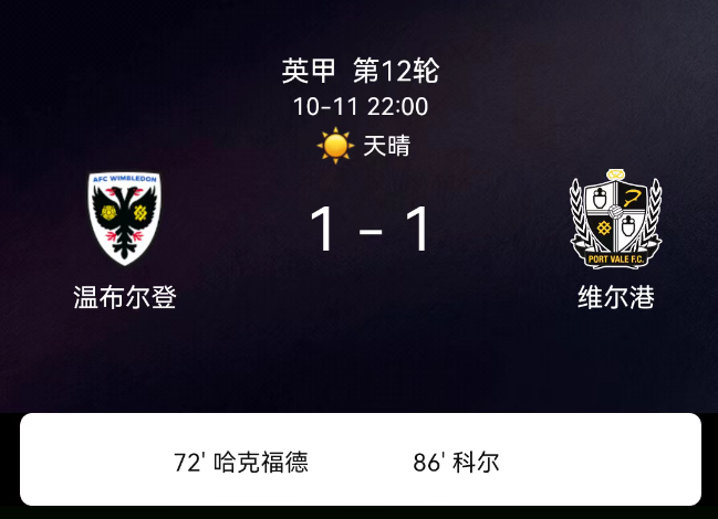 北京时间10月11日,英格兰足球甲级联赛第12轮,AFC温布尔登坐镇国王草地球场迎战维尔港。上半场双方攻防节奏平缓,第28分钟维尔港球员因中场拼抢犯规,吃到本场首张黄牌;第39分钟AFC温布尔登球员同样因防守犯规领黄,半场战罢双方0-0互交白卷。