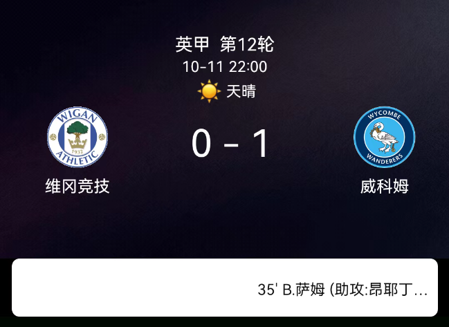 第35分钟(进球):韦康比流浪者破局!昂耶丁马助攻,山姆-贝尔推射破门,韦康比1-0领先。