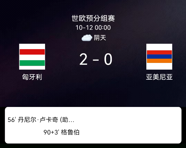 第90+4分钟(进球):匈牙利锁定胜局!容博尔-格鲁贝尔推射破门,匈牙利2-0领先。