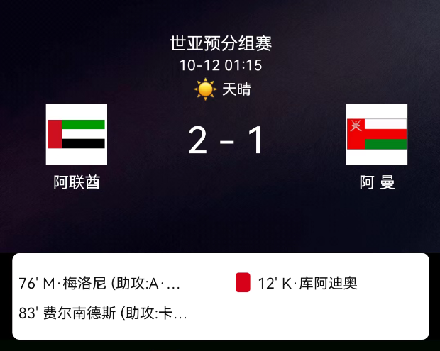 北京时间10月12日01:15,2026年世界杯亚洲区预选赛第四阶段第2轮A组焦点战,阿联酋迎战阿曼。第12分钟,阿曼率先破门,哈尔西射门击中阿联酋球员夸梅-夸迪奥变线入网,阿曼1-0领先;第76分钟,阿联酋扳平比分,马库斯-梅洛尼接传中禁区后点头球破门,1-1;第83分钟,阿联酋反超,卡约-卢卡斯禁区左路传中直接入网,2-1。最终比分,阿联酋2-1阿曼。