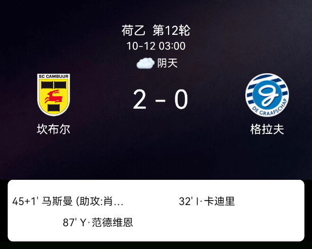 北京时间10月12日,荷兰乙级联赛第12轮,坎布尔主场迎战格拉夫夏普。第32分钟,格拉夫夏普球员卡迪里被红牌罚下;上半场补时第1分钟,OscarSjstrand助攻,BramMarsman破门,坎布尔1-0;第87分钟,YoramvanderVeen进球,坎布尔2-0。最终比分,坎布尔2-0格拉夫夏普。
