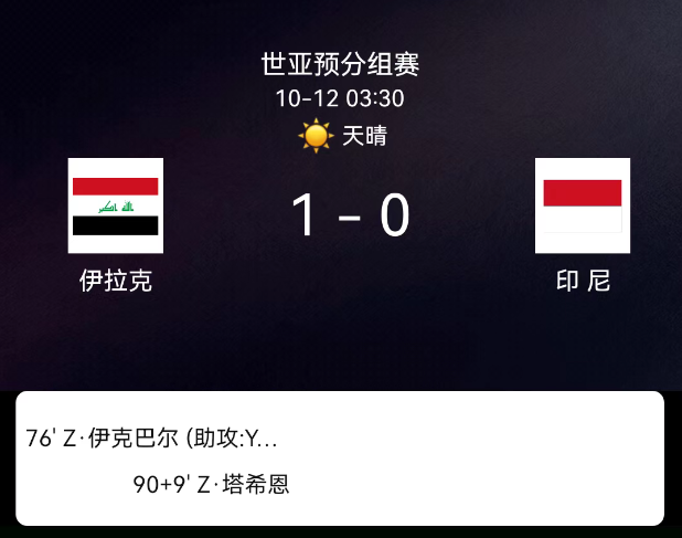 北京时间10月12日,2026年世界杯亚洲区预选赛第四阶段第2轮,伊拉克对阵印尼。第41分钟,印尼维尔东克犯规吃黄;第44分钟,印尼坎布阿亚犯规再吃黄;第67分钟,伊拉克塔赫辛犯规领黄;第76分钟,伊克巴尔接阿明助攻低射破门,伊拉克1-0;第90+10分钟,塔赫辛肘击累计两黄被罚下。最终比分,伊拉克1-0印度尼西亚。