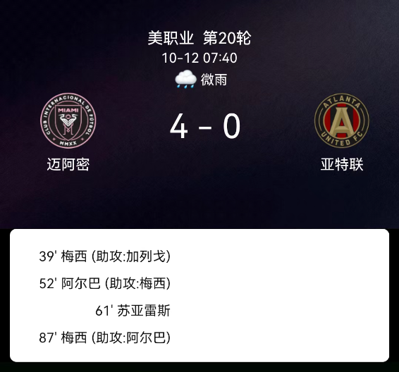 北京时间10月12日,美国职业大联盟常规赛,迈阿密国际主场迎战亚特兰大联。第38分钟,迈阿密前场抢断,梅西兜射破门,1-0;第52分钟,梅西助攻阿尔巴挑射破门,2-0;第61分钟,苏亚雷斯凌空抽射破门,3-0;第87分钟,梅西再入一球完成双响,4-0。最终比分,迈阿密国际4-0亚特兰大联。