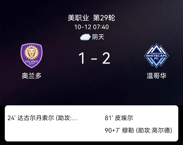 北京时间10月12日,美国职业大联盟常规赛,奥兰多城主场迎战温哥华白浪。第24分钟,麦圭尔助攻,索尔哈尔松破门,奥兰多城1-0;第48分钟,奥兰多城施勒戈尔犯规吃黄;第81分钟,内尔松-皮埃尔破门扳平,温哥华1-1;第90+7分钟,高尔德助攻,穆勒绝杀,温哥华2-1。最终比分,奥兰多城1-2温哥华白浪。