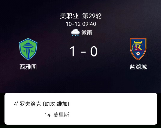 北京时间10月12日,美国职业大联盟常规赛,西雅图海湾人主场迎战皇家盐湖城。第4分钟,德拉维加助攻,罗思罗克破门,西雅图1-0;第13分钟,皇家盐湖城首吃黄牌;第14分钟,乔丹-莫里斯罚丢点球;第30分钟,皇家盐湖城克鲁斯再吃黄。最终比分,西雅图海湾人1-0皇家盐湖城。