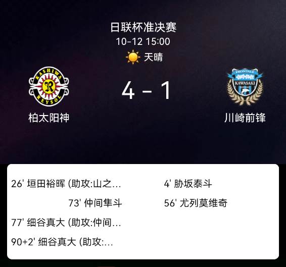 北京时间10月12日,日本联赛杯半决赛次回合,柏太阳神对阵川崎前锋。第4分钟,胁坂泰斗破门,川崎1-0;第26分钟,山之内佑成助攻垣田裕晖扳平,柏太阳神1-1;第45+3分钟,川崎先吃黄牌;第56分钟,乌雷莫维奇染红离场;第73分钟,仲间隼斗破门,柏太阳神2-1;第76分钟,川崎再吃黄牌;第77分钟,仲间隼斗助攻细谷真大破门,柏太阳神3-1;第81分钟,柏太阳神吃到黄牌;第90+2分钟,仲间隼斗助攻细谷真大双响,柏太阳神4-1。最终比分,柏太阳神4-1川崎前锋。