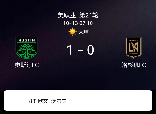 北京时间10月13日,美国职业足球大联盟常规赛,奥斯汀FC主场迎战洛杉矶FC。第10分钟,洛杉矶FC先吃黄牌;第17分钟,奥斯汀桑切斯犯规领黄;第54分钟,洛杉矶蒂尔曼犯规再吃黄;第75分钟,奥斯汀佩雷拉犯规吃黄;第77分钟,奥斯汀乔尔杰维奇犯规吃黄;第83分钟,欧文-沃尔夫头球破门,奥斯汀1-0。最终比分,奥斯汀FC1-0洛杉矶FC。