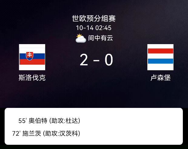 北京时间10月14日,2026年世界杯欧洲区预选赛第一阶段小组赛第8轮,斯洛伐克对阵卢森堡。第30分钟,斯洛伐克先吃黄牌;第43分钟,卢森堡穆拉托维奇犯规领黄;第55分钟,杜达助攻奥伯特破门,斯洛伐克1-0;第72分钟,汉茨科助攻施兰茨破门,斯洛伐克2-0;下半场末段,卢森堡库尔奇、塞利莫维奇、巴雷罗接连吃黄。最终比分,斯洛伐克2-0卢森堡。