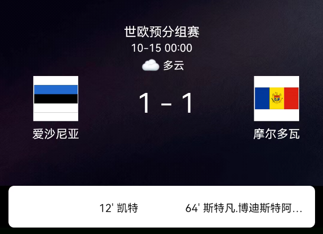 北京时间10月15日,2026年世界杯欧洲区预选赛第一阶段小组赛第8轮,爱沙尼亚主场迎战摩尔多瓦。第12分钟,凯特破门为东道主取得领先,爱沙尼亚1-0;第64分钟,波斯托拉基助攻博迪什特亚努扳平,摩尔多瓦1-1。最终比分,爱沙尼亚1-1摩尔多瓦。