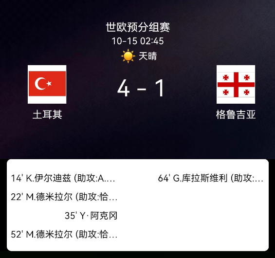 北京时间10月15日,2026年世界杯欧洲区预选赛第一阶段小组赛第8轮,土耳其主场迎战格鲁吉亚。第14分钟,巴尔达克奇助攻伊尔迪兹挑射破门,土耳其1-0;第23分钟,恰尔汗奥卢助攻德米拉尔头球破门,土耳其2-0;第35分钟,阿克金补射破门,土耳其3-0;第52分钟,恰尔汗奥卢再助攻,德米拉尔头球双响,土耳其4-0;第64分钟,达维塔什维利助攻科乔拉什维利扳回一分,格鲁吉亚1-4。最终比分,土耳其4-1格鲁吉亚。