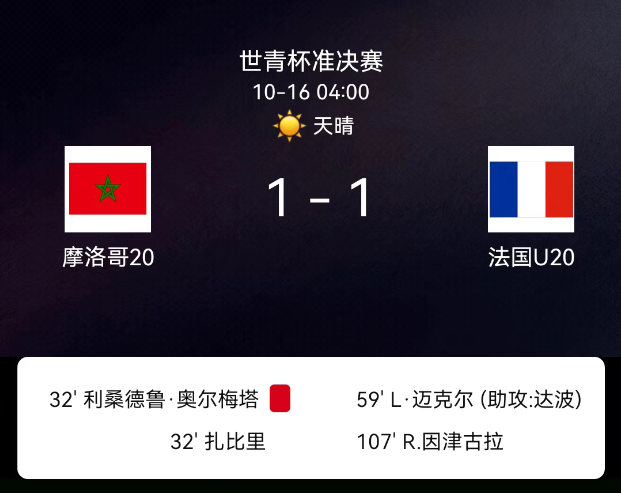 北京时间10月16日,U20世界杯半决赛,摩洛哥U20对阵法国U20。第32分钟,扎比里点球中柱折射入网,摩洛哥1-0;第59分钟,达博助攻米沙尔扳平,法国1-1;第107分钟,恩津古拉两黄变一红被罚下。点球大战法国两度失点,最终摩洛哥6-5胜出。