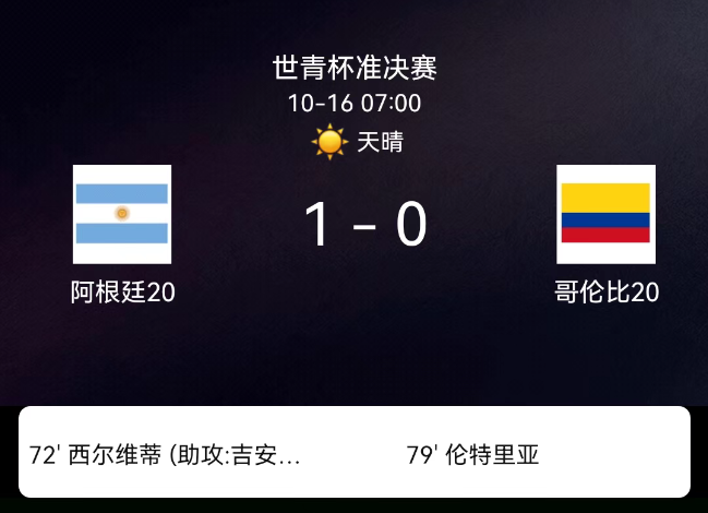 北京时间10月16日,U20世界杯半决赛,阿根廷U20对阵哥伦比亚U20。第72分钟,普雷斯蒂安尼突破斜塞助攻,西尔维蒂捅射破门,阿根廷1-0;第79分钟,伦特里亚累计两黄被罚下。最终比分,阿根廷U201-0哥伦比亚U20。