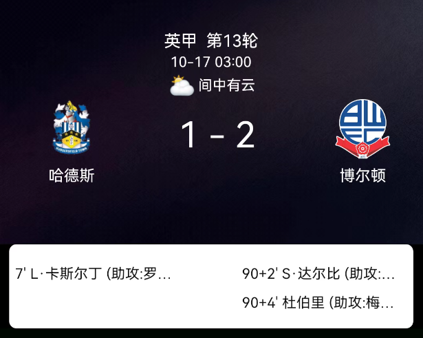 北京时间10月17日,英格兰足球甲级联赛第13轮,哈德斯菲尔德主场迎战博尔顿流浪者。第7分钟,罗斯肯助攻卡斯尔戴恩破门,哈德斯菲尔德1-0;第38分钟,博尔顿球员犯规吃黄;补时第3分钟,科齐尔-杜伯里助攻达尔比扳平,博尔顿1-1;补时第5分钟,伯斯托助攻科齐尔-杜伯里破门,博尔顿2-1。最终比分,哈德斯菲尔德1-2博尔顿流浪者。