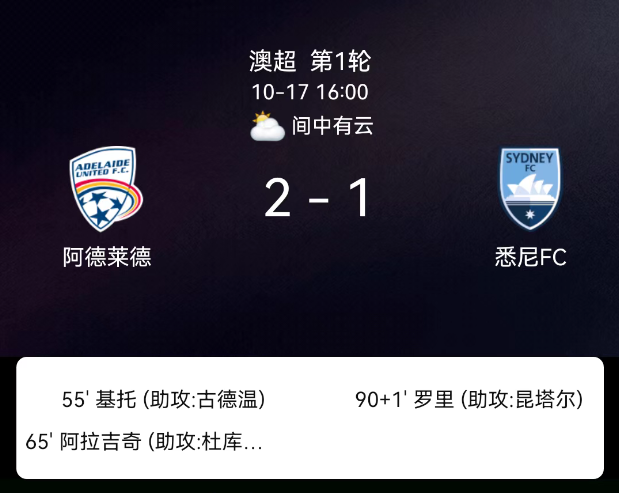 北京时间10月17日,澳大利亚足球超级联赛首轮,阿德莱德联主场迎战悉尼。第32分钟,悉尼球员犯规吃黄;第55分钟,古德温助攻基托破门,阿德莱德联1-0;第65分钟,杜库利助攻阿拉吉奇再下一城,阿德莱德联2-0;补时第1分钟,金塔尔助攻洛雷扳回一分,悉尼1-2。最终比分,阿德莱德联2-1悉尼。