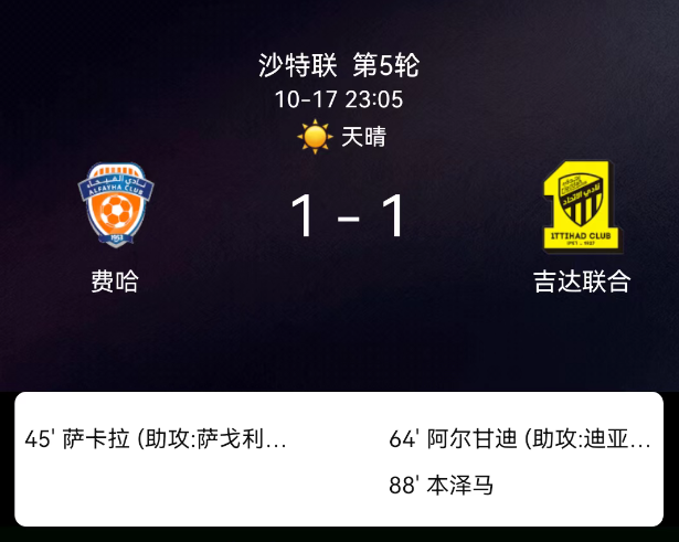 北京时间10月17日,沙特职业足球联赛第5轮,费哈主场迎战吉达联合。第28分钟,吉达联合球员犯规吃黄;第45分钟,雷梅塞罗助攻法什恩-萨卡拉破门,费哈1-0;第64分钟,穆萨-迪亚比助攻艾哈迈德-加姆迪扳平,吉达联合1-1;第88分钟,本泽马主罚点球未中。最终比分,费哈1-1吉达联合。