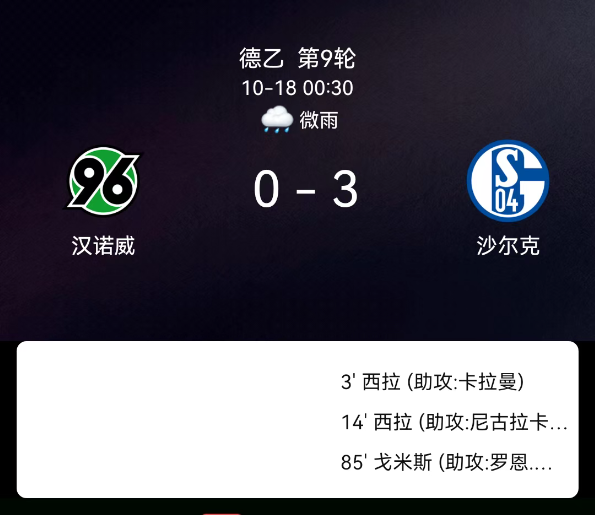 北京时间10月18日,2023-2024赛季德国足球乙级联赛第9轮,汉诺威96主场迎战沙尔克。第3分钟,卡拉曼助攻穆萨-西拉破门,沙尔克1-0;第14分钟,卡蒂奇助攻穆萨-西拉再入一球,沙尔克2-0;第41分钟,汉诺威96球员犯规吃黄;第85分钟,沙伦贝格助攻克里斯蒂安-戈米建功,沙尔克3-0。最终比分,汉诺威96 0-3沙尔克。