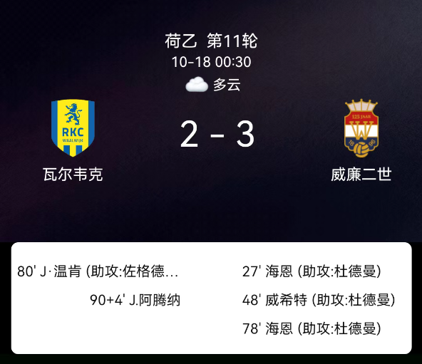北京时间10月18日,荷兰乙级联赛第11轮,瓦尔韦克主场迎战威廉二世。第27分钟,多德曼助攻德芬-亨破门,威廉二世1-0;第35分钟,瓦尔韦克球员犯规吃黄;第48分钟,多德曼再助攻费尔海特破门,威廉二世2-0;第78分钟,多德曼助攻德芬-亨双响,威廉二世3-0;第80分钟,Zorgdrager助攻于内肯扳回一分,瓦尔韦克1-3;补时第4分钟,阿尔特纳破门,瓦尔韦克2-3。最终比分,瓦尔韦克2-3威廉二世。