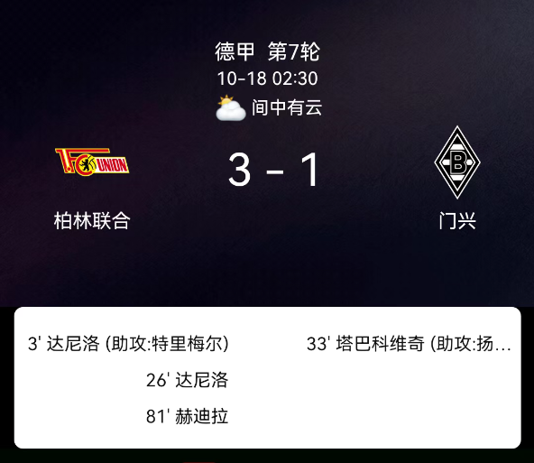 北京时间10月18日,2023-2024赛季德国足球甲级联赛第7轮,柏林联合主场迎战门兴格拉德巴赫。第3分钟,特里梅尔助攻多克希破门,柏林联合1-0;第22分钟,门兴球员犯规吃黄;第26分钟,多克希再入一球,柏林联合2-0;第33分钟,恩格尔哈特助攻塔巴科维奇扳回一分,门兴1-2;第81分钟,拉尼-赫迪拉破门,柏林联合3-1。最终比分,柏林联合3-1门兴格拉德巴赫。