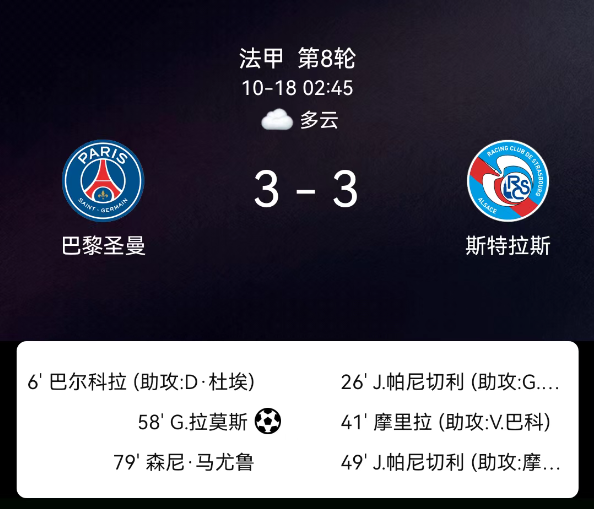 北京时间10月18日,法国足球甲级联赛第8轮,巴黎圣日耳曼主场迎战斯特拉斯堡。第6分钟,杜埃助攻巴尔科拉破门,巴黎1-0;第27分钟,帕尼切利头槌扳平,斯特拉斯堡1-1;第35分钟,巴黎球员犯规吃黄;第42分钟,莫雷拉破门反超,斯特拉斯堡2-1;第48分钟,帕尼切利再入一球,斯特拉斯堡3-1;第58分钟,贡萨洛-拉莫斯点射破门,巴黎2-3;第80分钟,马尤卢补射扳平,巴黎3-3。最终比分,巴黎圣日耳曼3-3斯特拉斯堡。