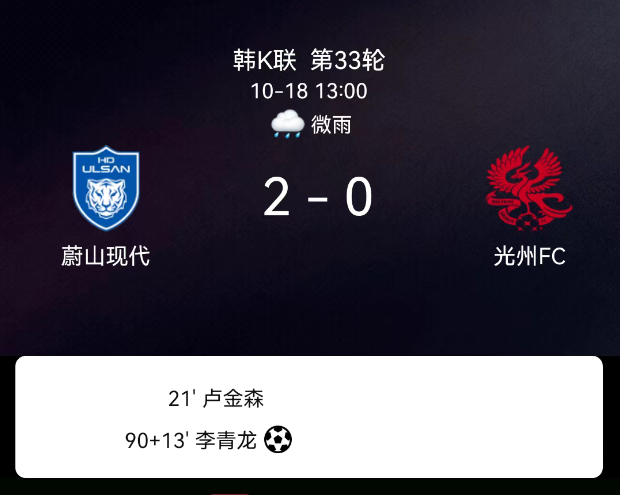 北京时间10月18日,韩国经典K联赛第33轮,蔚山HD主场迎战光州。第21分钟,路德维格松破门,蔚山HD1-0;第65分钟,光州球员犯规吃黄;补时第13分钟,李清龙罚入点球,蔚山HD2-0。最终比分,蔚山HD2-0光州。
