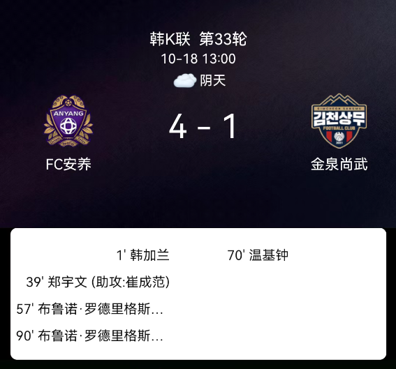 北京时间10月18日,韩国经典K联赛第33轮,安养主场迎战金泉尚武。第1分钟,Ka-ramHan破门,安养1-0;第21分钟,金泉尚武球员吃黄;第38分钟,安养球员吃黄;第39分钟,崔圣范助攻文诚友破门,安养2-0;第57分钟,金东珍助攻布鲁诺-莫塔破门,安养3-0;第70分钟,元基钟破门,金泉尚武1-3;第86分钟,金泉尚武球员再吃黄;第90分钟,金东珍助攻布鲁诺-莫塔双响,安养4-1。最终比分,安养4-1金泉尚武。