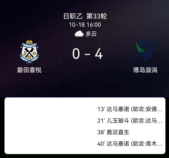 北京时间10月18日,日本职业足球乙级联赛第33轮,磐田喜悦主场迎战德岛漩涡。第13分钟,索尼-安德森助攻卢卡斯-巴塞洛斯破门,德岛1-0;第21分钟,卢卡斯-巴塞洛斯助攻儿玉骏斗破门,德岛2-0;第35分钟,磐田球员犯规吃黄;第38分钟,鹿沼直生破门,德岛3-0;第40分钟,卢卡斯-巴塞洛斯再入一球,德岛4-0。最终比分,磐田喜悦0-4德岛漩涡。